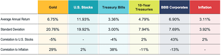 Gold has shown near-zero correlation to stocks but higher volatility than bonds.